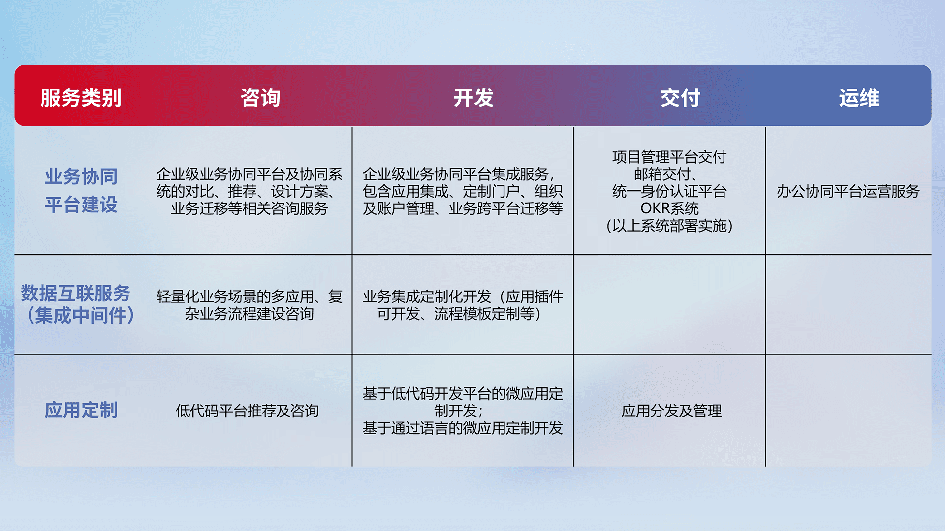 针对钉钉、、、企微、、、IDaas等平台级产品提供产品的规划、、方案、、、、交付、、、、定制化开发等服务,,,,实现如统一协同办公、、、智能客户服务、、、、混合会议管理、、、智能数据查询、、等业务场景,,,,实现数字化转型。。。